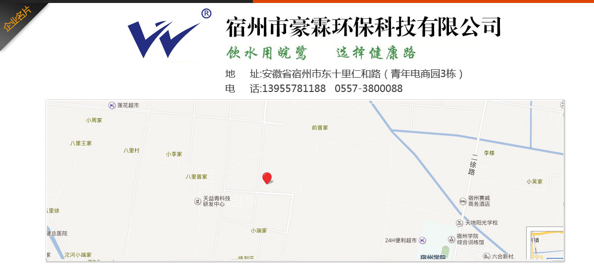 - 宿州市豪霖環(huán)保科技有限公司專業(yè)致力于水處理產(chǎn)品和系統(tǒng)水處理工程,集產(chǎn)品的開發(fā)與銷售、工程配套與安裝、技術(shù)咨詢與服務(wù)于一體的新型環(huán)保企業(yè)。主營產(chǎn)品:家用、商用純水機(jī)系列,能量活水機(jī)系列,家用、中央用凈水器系列,管線機(jī),泵、膜系列,各種零配件、水處理耗材等配套產(chǎn)品系列,循環(huán)冷卻水處理系統(tǒng),鍋爐軟化水處理系統(tǒng),海水、苦咸水淡化、污水處理系統(tǒng),軟化及過濾裝備,紫外線及臭氧消毒設(shè)備等全部產(chǎn)品。